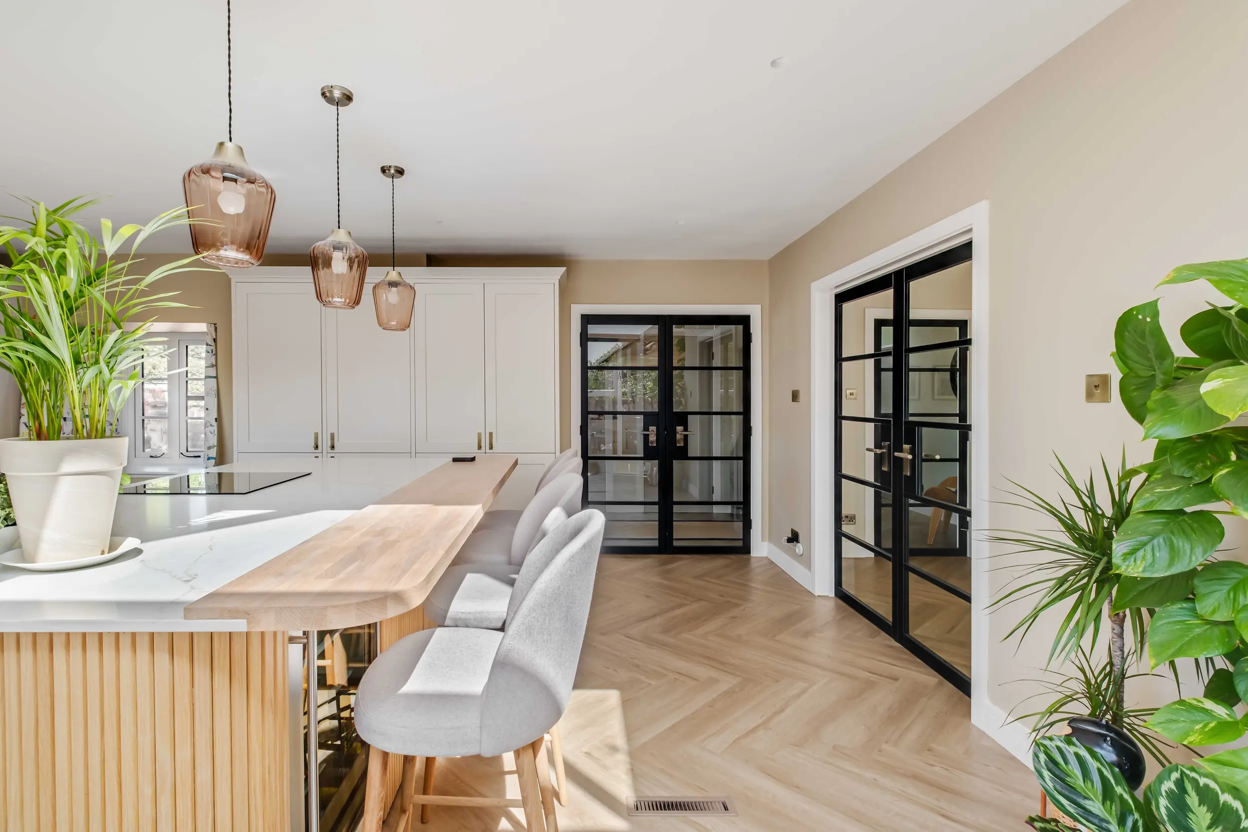 Existing wall between the kitchen and dining room was removed, opening up the space dramatically. The dining area was further extended into the former snug, and a new roof structure with a central roof lantern was added—flooding the room with natural light. All structural timbers were carried above the ceiling line to allow for a continuous, uninterrupted flat ceiling, enhancing the sense of openness.